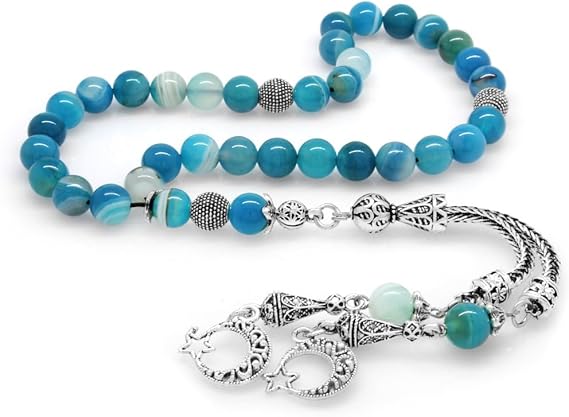 Kararmaz Metal Ayyıldız Püsküllü Küre Kesim Mavi-Beyaz Akik Doğaltaş Tespih